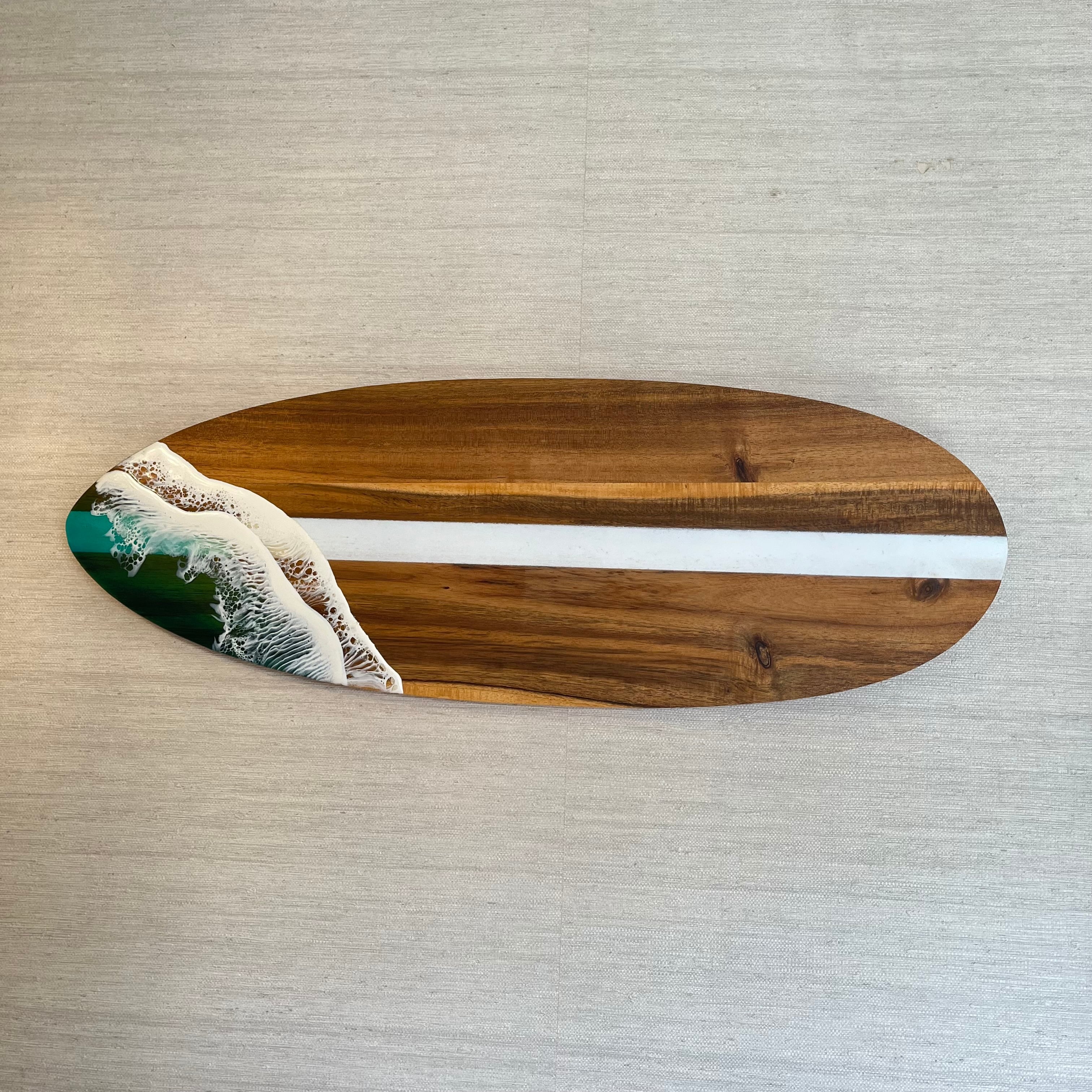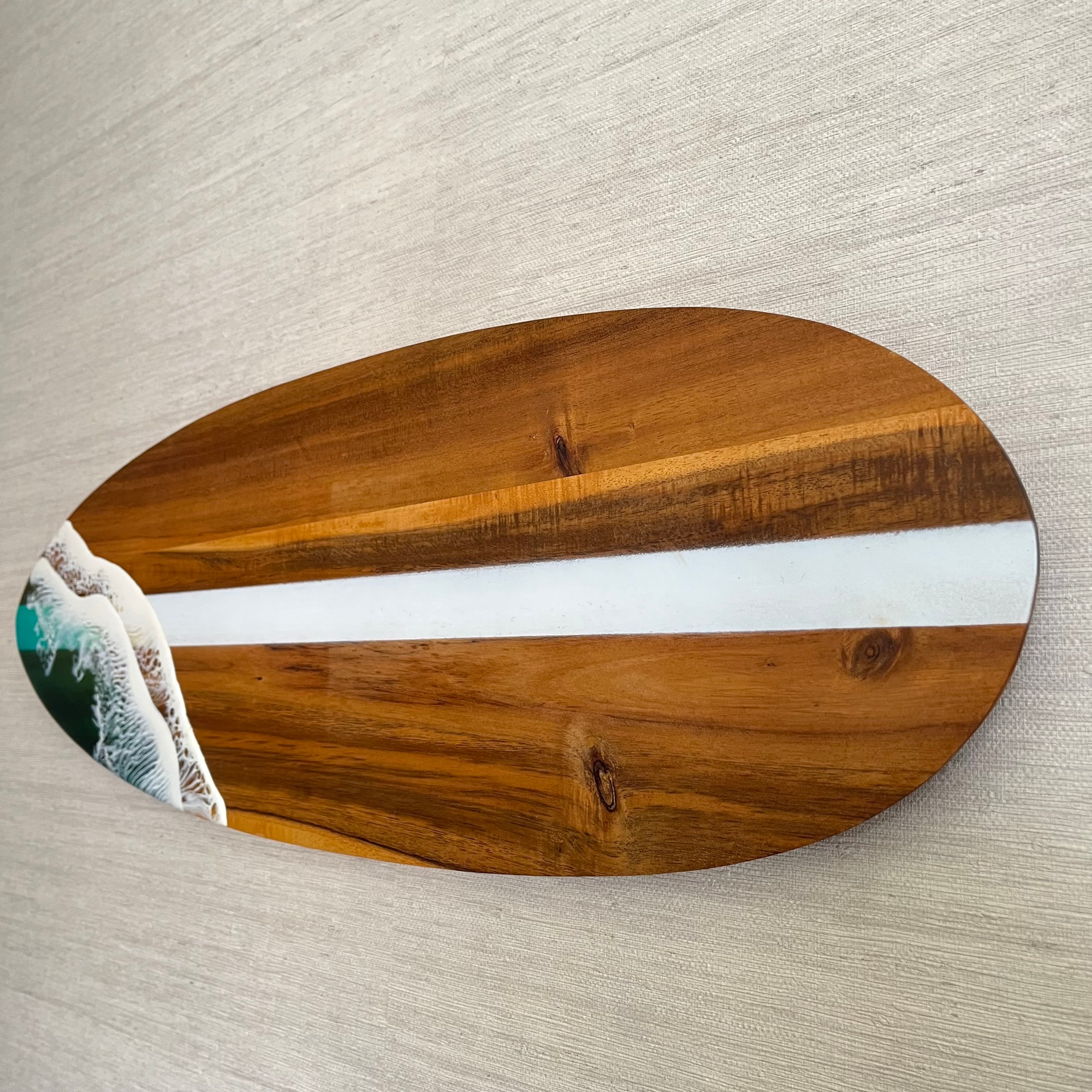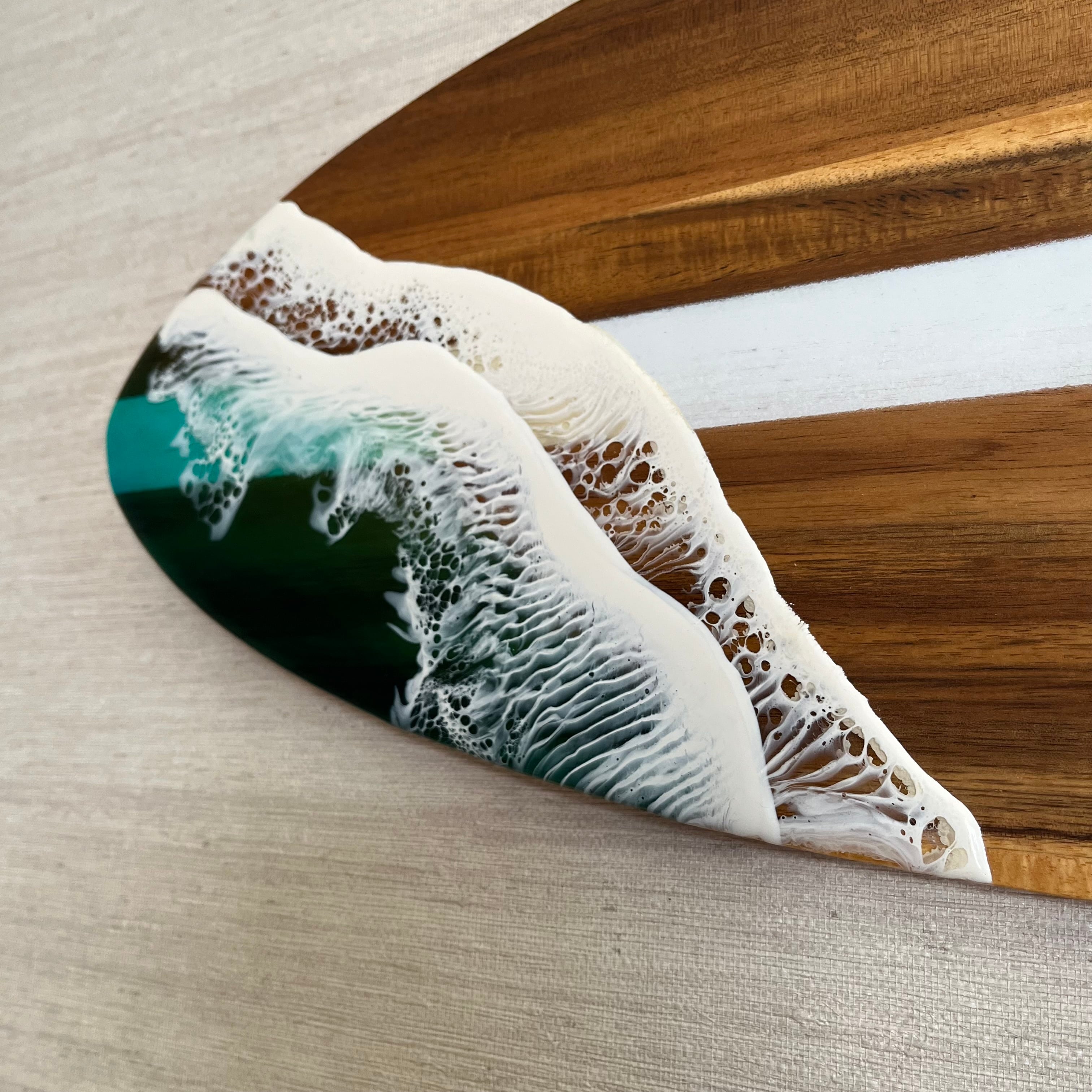 木目が美しいサーフボード型のミニテーブルに波を流しました♪